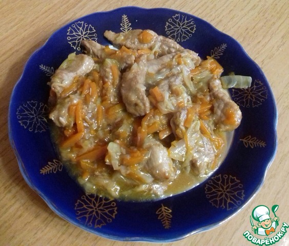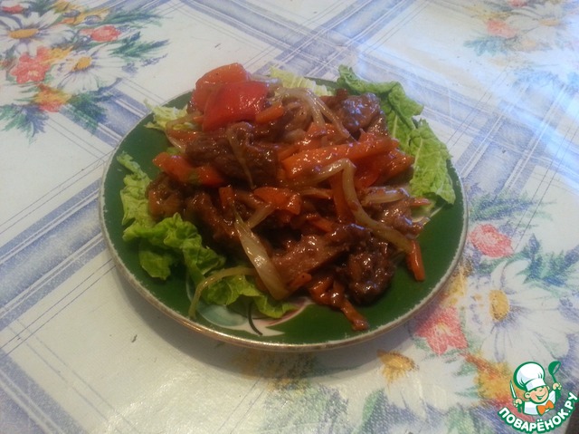 Для приготовления этого блюда лучше всего взять вок, но так как я пока о нем только мечтаю, готовила в сковороде... В глубокой сковороде (воке) разогреваем растительное (оливковое) масло и выкладываем маринованное мясо, прямо с маринадом. На сильном огне обжариваем мясо со всех сторон, постоянно помешивая. Следите, чтобы мясо не слипалось и не пригорало. Готовое мясо выкладываем на блюдо и начинаем обжаривать морковь. Обжариваем, непрерывно помешивая, около 2-3 минут, затем к моркови возвращаем мясо и жарим все вместе еще 2-3 минуты. Далее добавляем пекинскую капусту, сахар и перец. Жарим все вместе, также помешивая еще 2-3 минуты.