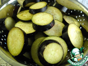 1. Баклажаны помыть, удалить плодоножку и нарезать кружочками толщиной приблизительно 1 см. Пересыпать кружочки солью и оставить на 20-30 минут, пока баклажаны не пустят сок, затем промыть их холодной водой.