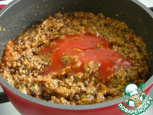 5. Добавить томатный сок, соль, сахар, черный молотый перец, перемешать, довести до кипения, а затем тушить на медленном огне под крышкой 30-40 минут, все время помешивая.