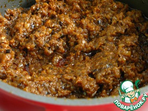 Если ускорять этот рецепт по времени и увеличивать объем, то я бы баклажаны сначала без шкурки выпарила в духовке а затем обжарила бы в этой же духовке в масле при температуре 250-280°С с добавлением в конце муки. Мука в конечном продукте должна давать лёгкий ореховый вкус и здесь она ещё играет роль эмульгатора- загустителя.