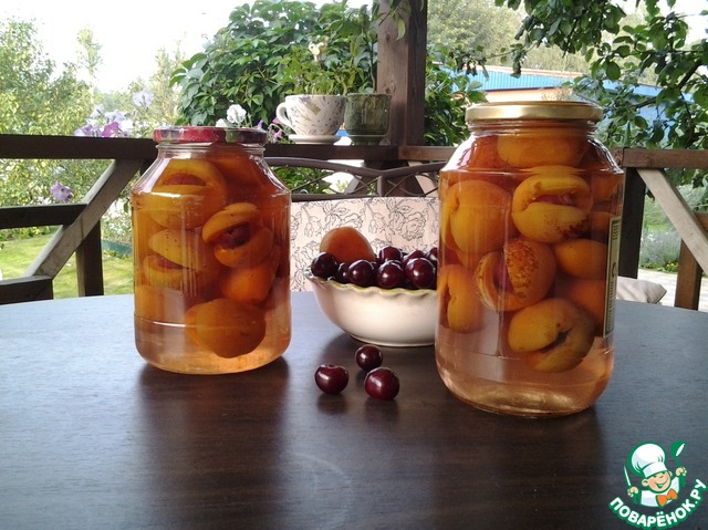 Рецепт на 1,5 л. банку. Абрикосы и вишню помыть. Абрикосы надрезать вдоль не до конца и удалить косточку. Получаются как бы раковинки со створками. У вишни удалить косточки.