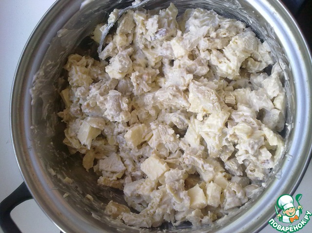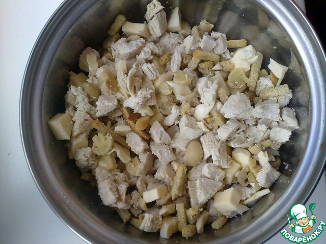 Куриное филе отвариваем. Нарезаем грибы (не очень мелко), сыр сулугуни, филе кубиками. Добавляем сухарики.