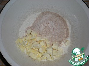 Для основы тарта я брала пшеничную муку и цельнозерновую пшеничную. Холодное масло нарезать кубиками, смешать с мукой и щепоткой соли. Быстро растереть пальцами в крошку.