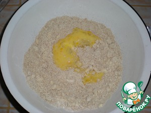 Яйцо размешать вилкой с 2 ст. л. холодной воды. Влить в мучную крошку и замесить тесто. Тесто получается эластичное, быстро смешивается. Месить его долго не нужно, чтобы масло не нагрелось от тепла рук.