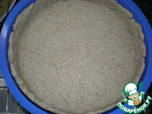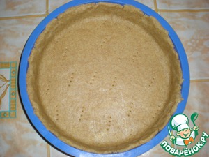 Раскатать тесто в пласт, чтобы он поместился в форму диаметром 24 см и образовал небольшие бортики. Наколоть основу вилкой, затянуть пленкой и поставить в холодильник.