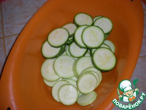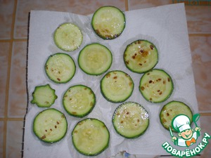 Кабачки тонко нарезать и поджарить на сковороде. Идеально бы пожарить на сквороде гриль, чтобы без масла... Но у меня таковой не имеется, поэтому я жарила в обычной в небольшом количестве растительного масла.