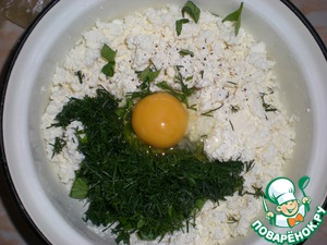 Добавить в творог зелень, соль, перец и одно яйцо. Все хорошо размешать.