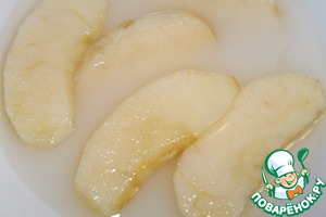 Картофельный крахмал развожу в небольшом количестве воды, приблизительно в 50-60 мл и обмакиваю в довольно густой раствор яблочные дольки по одной или несколько сразу. Это зависит от толщины нарезанных долек и "крепости" мякоти, нельзя, чтобы они сломались и развалились.