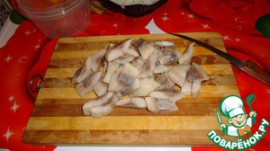 Затем берем филе или целую селедку. Обрабатываем ее, привычным для вас образом и нарезаем на порционные кусочки.