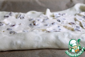 На противень с пекарской бумагой выкладываем тесто. Творожно-изюмительную массу размазываем по всей поверхности теста.