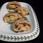 Вот такая "змеюка" получается. Ее нужно разрезать (не очень тонко, у меня было 6 кусочков). По желанию можно смазать желтком, но я никогда не смазываю. Ставим слойки в предварительно нагретую до 200С духовку. Выпекаем около 30 минут. Я всегда смотрю "по состоянию" - если тесто хорошо поднялось и стало немного коричневатым, выключаю духовку и оставляю слойки еще минут на 5. Т. е. теоретически, времени может уйти и меньше - в зависимости от духовки.