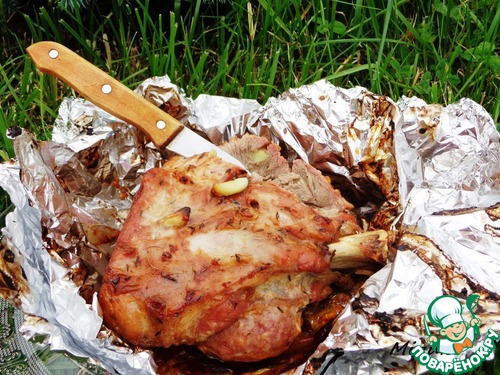 Такую рульку очень удобно брать с собой на природу. А можно и запечь её прямо на пикнике, тогда дома останется только замариновать её. В любом случае, мясо получается очень сочное и мягкое.