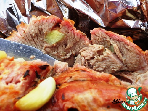 Нашпиговываем каждую рульку нарезанным чесноком, заворачиваем в фольгу. Выпекаем в разогретой до 200 градусов духовке 1ч. 20 минут. Затем развернём фольгу и выпекаем ещё 30 минут.