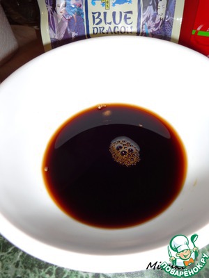 Делаем маринад. Берем соевый соус, добавляем 1 нарезанный зубчик чеснока. Я использую продукцию Dlue Dragon.