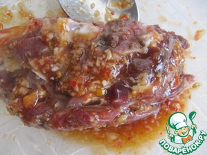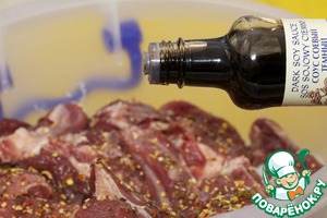 • Оставшийся маринад выливаем сверху. В этом рецепте соль не использовалась совсем, поэтому в конце приготовления влила еще немного соевого темного соуса. Ставим для маринования в прохладное место на 3-12 часов для смешения всех ароматов и дальнейшего вызревания мяса.