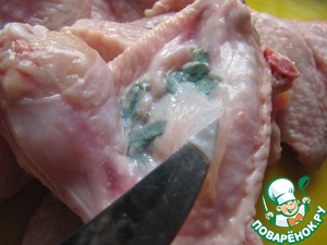 Взять охлажденные крылья курицы, отрезать острый край крыла.