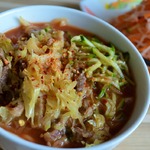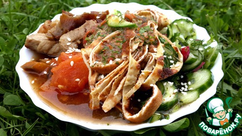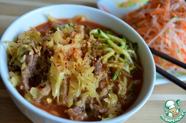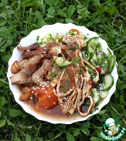 Многие ученые - исследователи восточных культур утверждают, что это замечательное легкое и сытное блюдо пришло к нам из Южной Кореи. Об этом говорит не только тонкая лапша, которая является его основой, но и насыщенный специфический острый вкус, который придает блюду особую свежесть и пикантность. Название его происходит от корейского слова «куксичуми» — так называют смесь разных овощей, входящих в состав супа. Впервые это блюдо мне довелось попробовать не так давно в гостях у корейской семьи, наших друзей, правда, они всю жизнь прожили в России в Краснодаре, но очень любят родную кухню и готовят Кукси с душой. Я была приятно удивлена и теперь готовлю его именно по этому семейному рецепту сама. Предлагаю и вам познакомиться еще с одним вариантом приготовления вкусного холодного супа, который, я уверена, займет прочное место в вашей кулинарной книге и будет одобрен близкими и любимыми людьми. Супчик этот несложен, хотя может показаться, что слишком долог в приготовлении, поверьте, это не так. Еще одна прекрасная особенность супа в том, что все заготовочки можно сделать заранее дома, от этого вкус станет только насыщеннее, лапшу купить Кукси-моченку, ее не нужно варить - всего лишь размочить в воде, а на природе насладиться прекрасным сочетанием свежих овощей и нежного мяса с освежающим бульоном. + бонус, вариант закуски из салатов от Кукси со сладким соусом чили - лайм от Blue Dragon на картофельной лепешечке