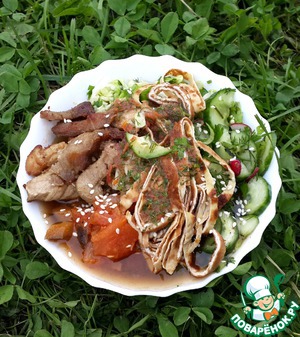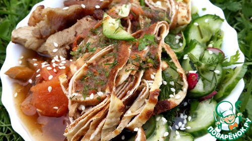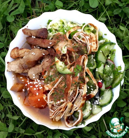2-й вариант: на лепешечку выкладываем салат из овощей, мясо, нарезанный блинчик, посыпаем свежей зеленью, добавляем сладкий соус чили с лаймом от Blue Dragon.