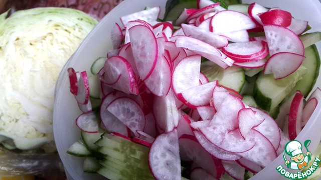 С капусты и огурцов слить образовавшийся сок, можно добавить его в наш «кукси-мури». В капусту добавим половину зажарки, половину зелени, раздавим зубчик чеснока, приправим кориандром, солью и небольшим количеством сахара.