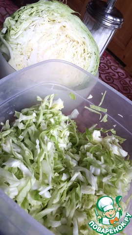 Капусту тонко нашинковать, присолить, добавить сахара по вкусу, немного примять ручками и перемешать. Оставить просаливаться.