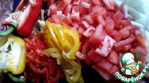 На оставшихся томатах сделать крестообразный надрез, залить кипятком на 1 минуту, снять кожицу. Нарезать небольшим кубиком.
