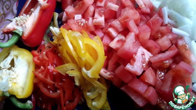 На растительном масле половину лука обжарить до румяной корочки, добавить нарезанные кубиком томаты, тушить около 5 минут,