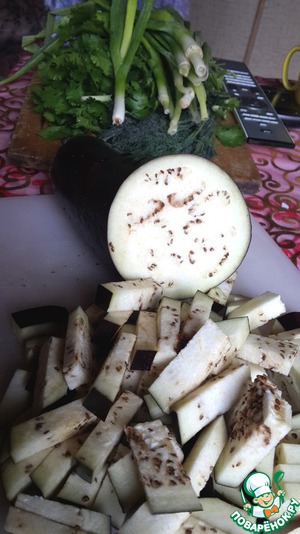 добавить сладкий перец, баклажан, тушить до готовности около 5 минут. Немного присолить. -