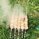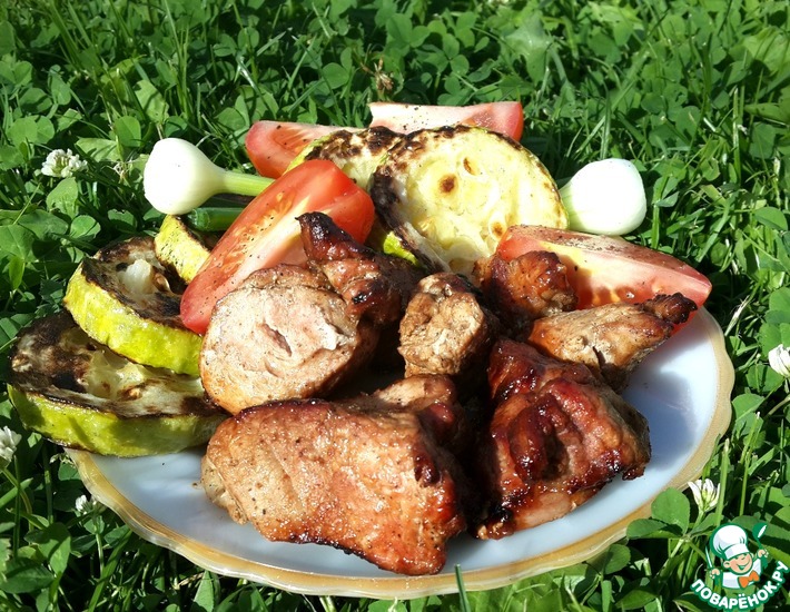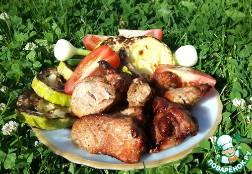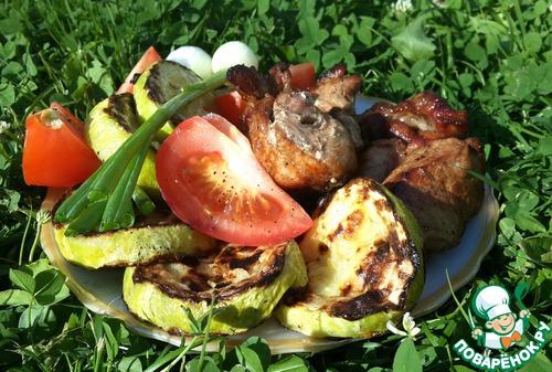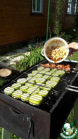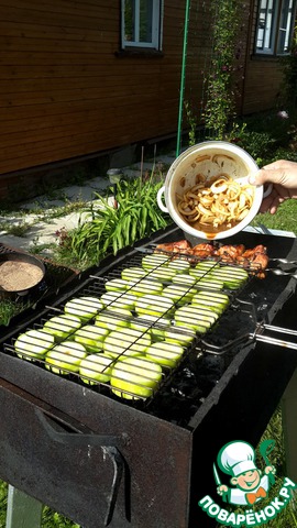 Кабачки выкладываем на решетку, жарим 5-10 минут, шашлык как раз за это время "доходит", для сочности немного поливаем его получившимся маринадом