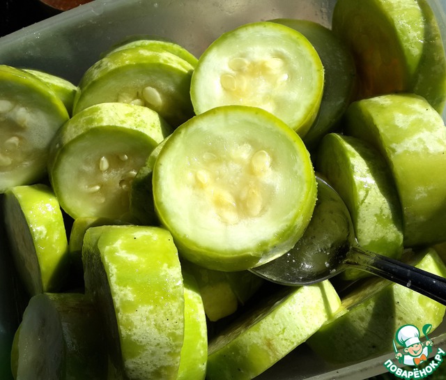 Кабачки нарезать кружочками толщиной 1,5-2 см, смешать с оливковым маслом, присолить