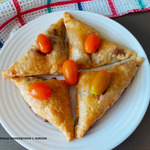 2. Тесто разделить на 10 пластиков, в каждый положить начинку, закрыть, защипнуть, положить на противень 9его смочить холодной водой). Поставить в холодильник.