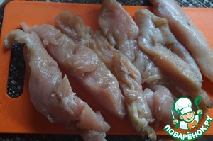 Куриное филе нарезать не толстыми палочками.