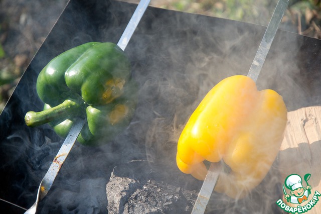 Перцы обжарить на огне до черной корочки.