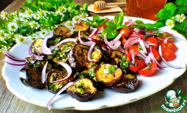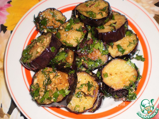Баклажаны уже начинают потихоньку завоевывать прилавки, поэтому хочу поделиться отличным рецептом. Изумительные баклажаны! Медово-соевый маринад придает им совершенно необычный вкус, а зелень приятно его оттеняет. Рекомендую попробовать.