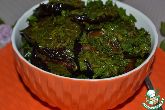 Затем складываем в глубокую посуду баклажаны, затем слой зелени, потом снова баклажаны и так пока не буде что укладывать.