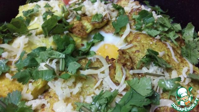 Отдельно обжариваем две луковицы, добавляем в жареный лук очень мелко порезанные помидоры, лавровый лист, тушим 2-3 мин. Затем на сковороду укладываем слоями оладьи, жареный лук с помидорами, снова оладьи - лук с помидорами. Посыпем зеленью, тушим 5-10 мин в духовке или СВЧ. Не рекомендую солить сильно, все таки лето, лучше придать немного остроты приправами, или выдавить чесночку сверху. Можно перед запеканием сделать луночку по центру сковороды и вбить туда сырое яйцо.