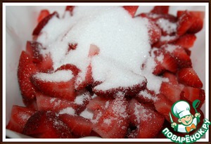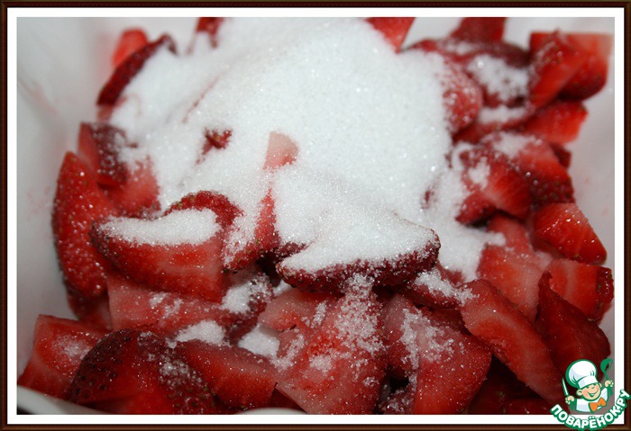 • 7. Клубнику нарезать на кусочки и перемешать с 1/4 стак. сахара и отправить на 30 мин. в холодильник.