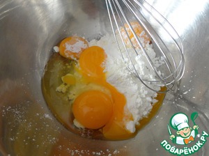 В мисочке венчиком взбиваем 1 целое яйцо и 3 желтка с сахаром и кукурузным крахмалом.