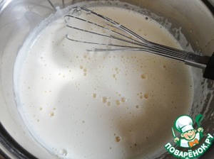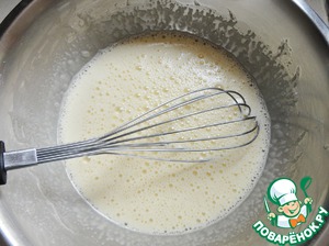 Как только молоко начнет закипать, добавляем примерно его треть в мисочку с яйцами, постоянно помешивая смесь.