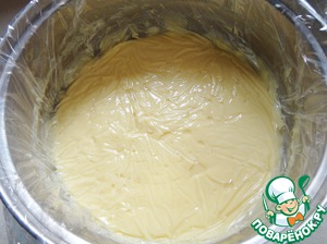 Снимаем крем с огня и накрываем его пищевой пленкой так, чтобы она касалась поверхности крема. Крем должен очень хорошо остыть. Лучше оставить его в холодильнике по меньшей мере на 4 часа после его остывания.