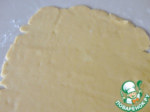 Прогреваем духовку до 170 градусов. Раскатываем тесто на слегка присыпанной мукой поверхности в тонкий пласт.