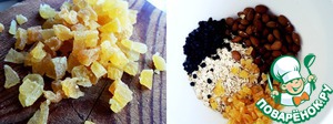 - Орехи, цукаты, хлопья, ягоды перемешать, лучше всего венчиком. -