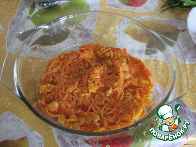 Морковь натереть на крупной терке. Курагу нарезать кубиками, залить водой, довести до кипения и добавить к морковке. Добавить немного майонеза (у меня соус для рыбы) и перемешать.