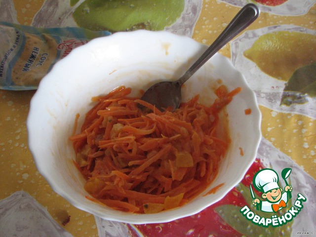 Рыбу обжарить на сковороде, слегка посолить (я специями не приправляла, т. к. у меня не майонез, а "Соус для рыбы и морепродуктов", он уже со специями. Если готовите с майонезом, добавьте специи). Выложить сверху на морковь. Посыпать сверху луком.