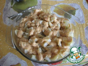 Картофель порезать крупными кубиками и обжарить на масле, слегка посолить. Выложить сверху на рыбу. Залить майонезом. Запекать в духовке при температуре 220.
