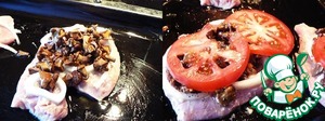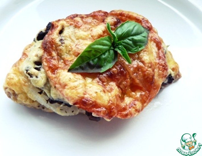 Выложить на каждый кусочек мясо жаренные лисички, посыпать базиликом.