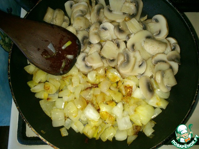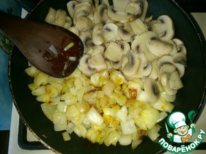 В сковородку к луку добавляем грибы и жарим все вместе на небольшом огне минут 10.