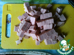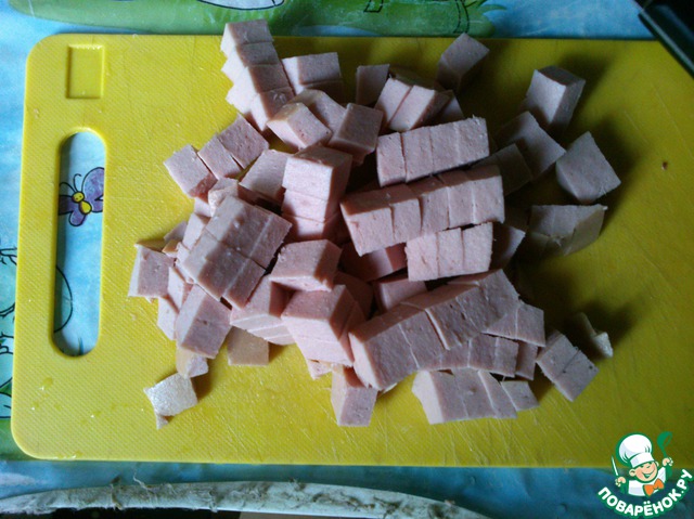 Колбасу режем на брусочки.