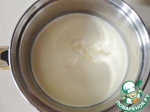 В кастрюлю наливаем сливки, молоко и сахар. Перемешиваем.