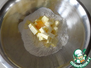 Сначала сделаем тесто бризе. Можно воспользоваться миксером (насадкой лопатка) или замесить руками. В этом случае просеиваем муку в миску, делаем углубление в центре. Кладем в него порезанное кубиками масло, молоко, соль, 1/2 ст. л. сахара и 1 яйцо.