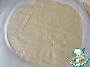 Достаем тесто из холодильника. Если оно слишком твердое, мнем его немного руками. Раскатываем его между двумя листами кондитерской бумаги толщиной примерно 4 мм.